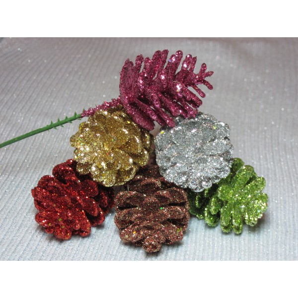 Shimmering, glittered pinecones. About 1-1/2" wide & 2" long (not including the pick). Sold individually.