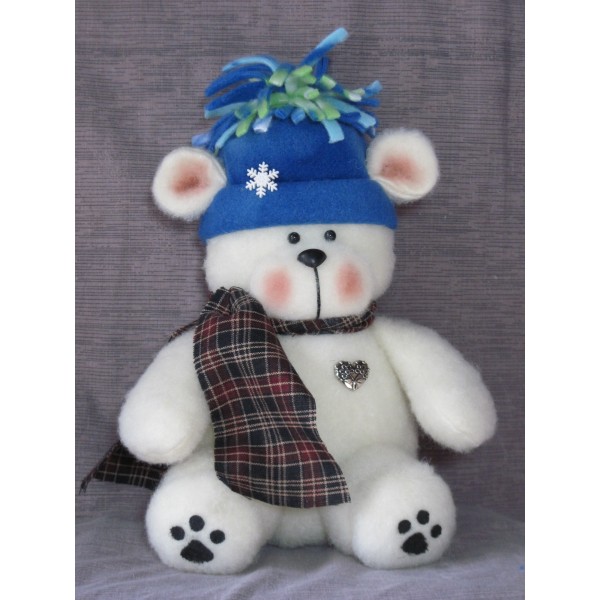 This cute polar bear is all tuckered out from romping with his buddies & is taking a break! The finished product measures 9" tall, 7" wide, & 5" deep.