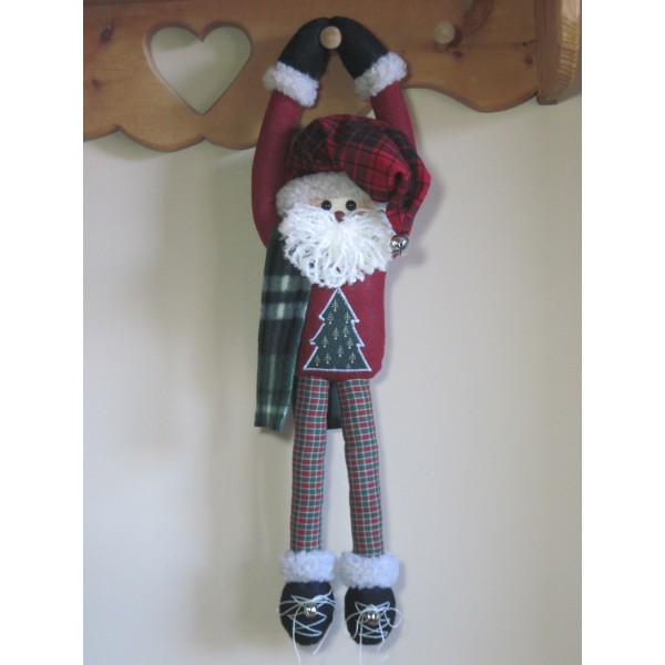 Though this Santa was originally designed to be a doorknob hanger, he looks super cute hung from a shelf, too! Made of felt, flannel, and cotton, the finished product measures 21-1/2" tall, 6-1/2" wide, & 3" deep.