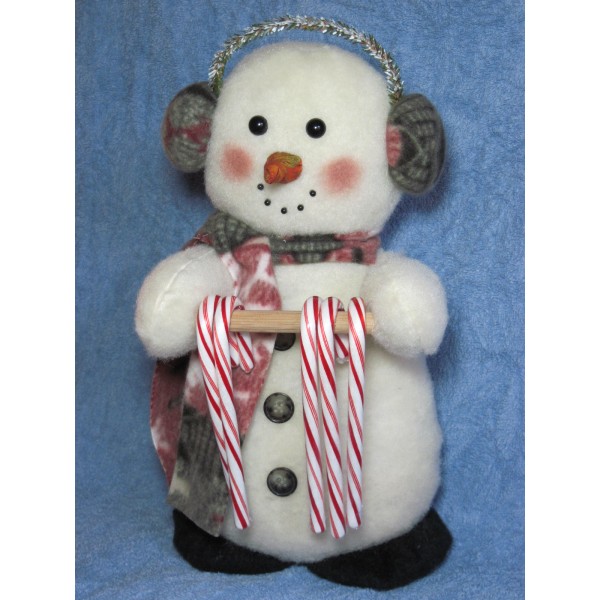 A new twist on a festive candy cane holder -- a snuggly snowman! The finished product measures 14" tall, 7" wide, & 4-1/2" deep.