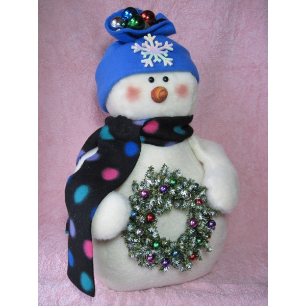 How can you resist buying a wreath from this sincere fellow? The photo is deceiving, for this is the plumpest snowman pattern! Made of plush felt & weighted for stability, the finished product measures a hefty 18" tall, 9" wide, & 9" deep.